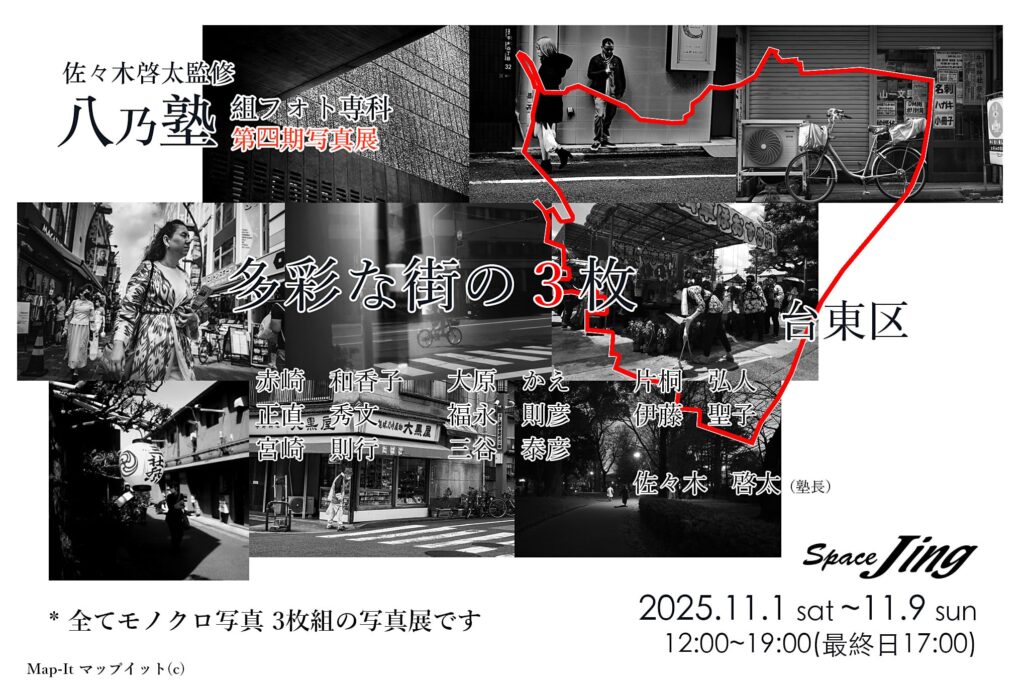 ホーム > 開催中/予定の展示 > 八乃塾組フォト専科 第四期写真展 「多彩な街の3枚」台東区 2025/11/02 会期 2025年11月1日(土)〜11月9日(日) 12:00〜19:00(最終日17:00終了) 出展者 赤崎和香子/大原かえ/片桐弘人/正直秀文/福永明彦/伊藤聖子/宮崎則行/三谷泰彦 佐々木啓太塾長・監修 - 開催中/予定の展示